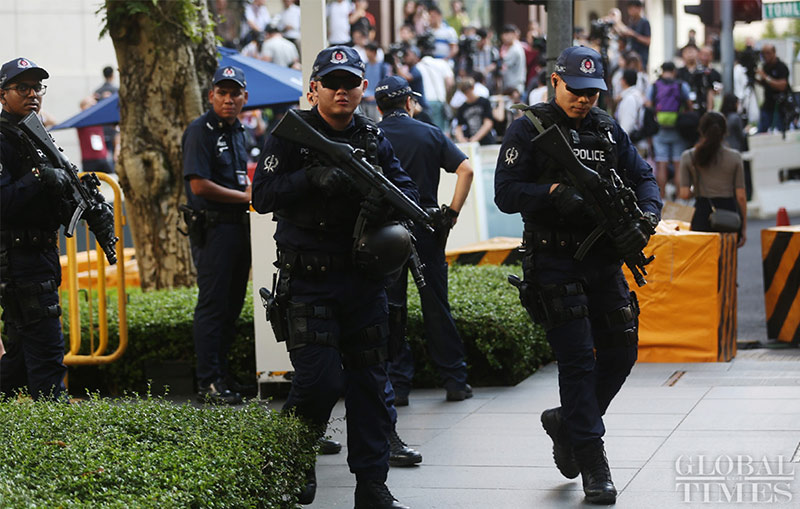 La policía de Singapur patrulla para garantizar la seguridad fuera del hotel St. Regis, donde el líder norcoreano Kim Jong-un se hospeda el domingo. Foto: Cui Meng / GT