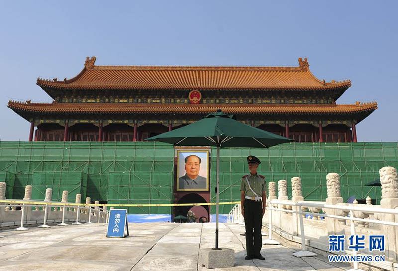 La rutina anual de mantenimiento de la tribuna de la Plaza de Tian'anmen, previo al Día Nacional, 2011.
