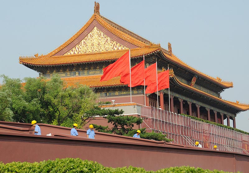 La tribuna de la Plaza de Tian'anmen es restaurada utilizando técnicas artesanales tradicionales chinas, 2013.