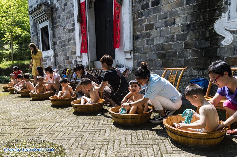 HUBEI, junio 12, 2018 (Xinhua) -- Ni?os toman ba?os con agua de artemisa, en el condado de Zigui, provincia de Hubei, en el centro de China, el 12 de junio de 2018. Una actividad de costumbre popular fue llevada a cabo el martes en Zigui para saludar al próximo Festival de Botes de Dragón. (Xinhua/Wang Aiping)