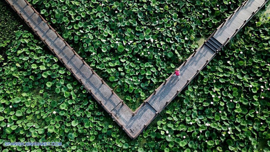 ANHUI, junio 14, 2018 (Xinhua) -- Una turista toma fotografías de las flores de loto en la villa de Xihu en la ciudad de Tongling, provincia de Anhui, en el este de China, el 14 de junio de 2018. (Xinhua/Zhang Duan)