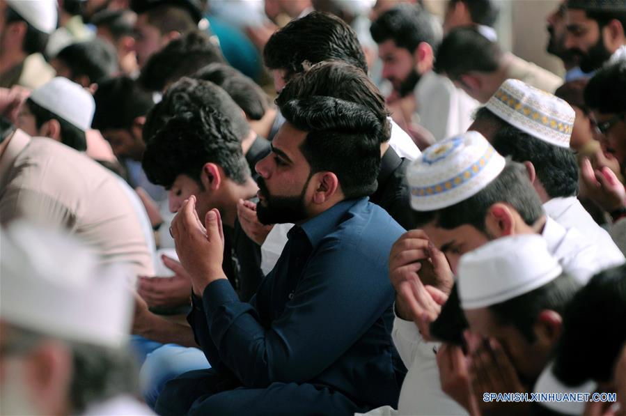 Musulmanes pakistaníes oran durante las oraciones del Eid al-Fitr en la Mezquita Jamia, en Rawalpindi, Pakistán, el 16 de junio de 2018. (Xinhua/Ahmad Kamal)