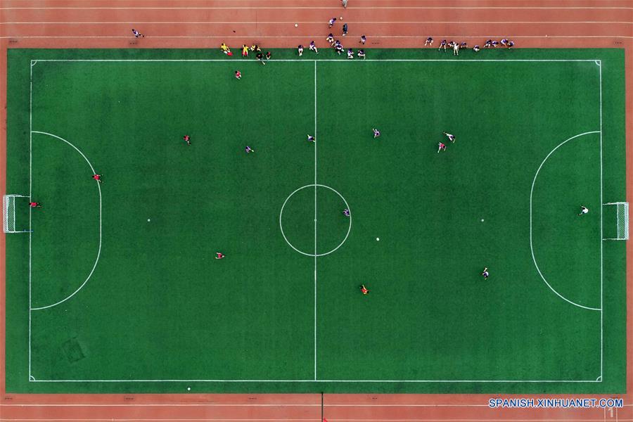 HEBEI, junio 18, 2018 (Xinhua) -- Alumnos compiten durante un partido de fútbol en la Escuela Primaria de Arte de Beixin durante el tercer día del feriado de tres días por el Festival del Bote del Dragón, en el condado de Ningjin, provincia de Hebei, en el norte de China, el 18 de junio de 2018. (Xinhua/Chen Lei)