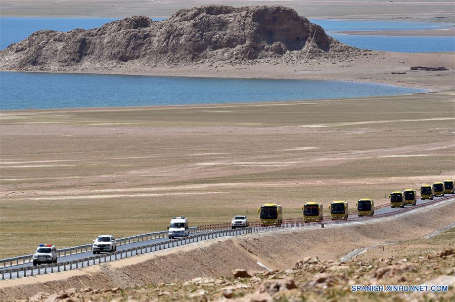 Una caravana de autobuses traslada a aldeanos desde el condado Nyima de Nagqu a un nuevo asentamiento en Lhasa, durante un programa de reubicación con el objetivo de proteger el medio ambiente, en Lhasa, Región Autónoma del Tibet, en el sureste de China, el 18 de junio de 2018. Un total de 1,102 residentes fueron reubicados a un nuevo asentamiento en Lhasa para volver accesibles sus antiguos vecindarios para animales salvajes en la Reserva Nacional Natural de Qiangtang. Finalizada el lunes, esta reubicación forma parte del primer programa llevado a cabo a favor de la protección del medio ambiente en áreas de gran altitud de la Región Autónoma del Tibet, en el sureste de China. (Xinhua/Chogo)