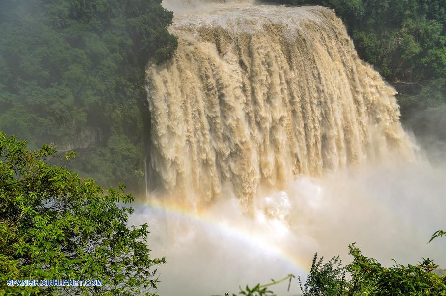 GUIZHOU, junio 20, 2018 (Xinhua) -- Vista de la Cascada Huangguoshu en Anshun, provincia de Guizhou, en el suroeste de China, el 20 de junio de 2018. Afectada por la lluvia constante, la Cascada Huangguoshu vio el miércoles su flujo máximo en la temporada de inundaciones de este a?o, con el caudal alcanzando los 395 metros cúbicos por segundo. (Xinhua/Cui Yu)