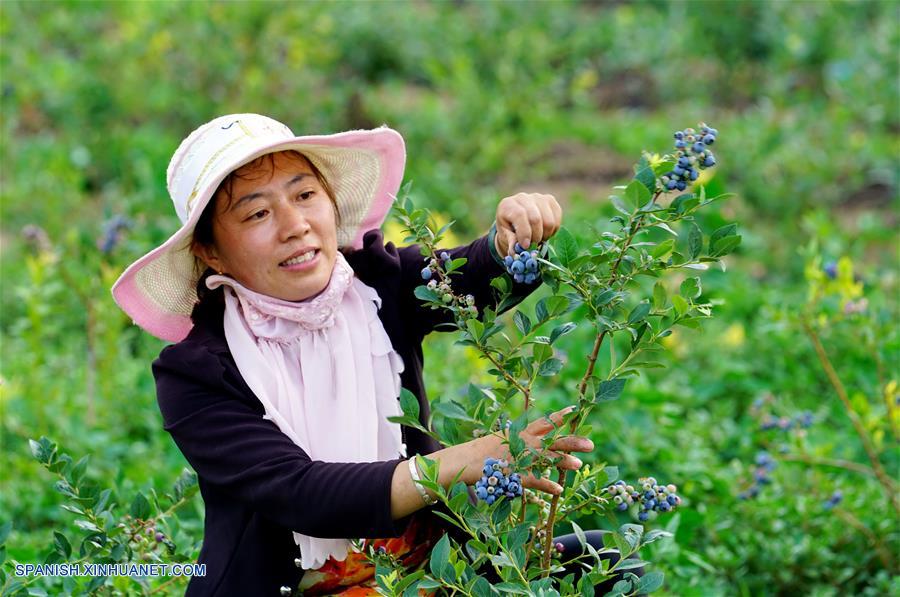HEBEI, junio 20, 2018 (Xinhua) -- Una mujer recolecta arándanos en la villa de Sanshanyuan de la localidad de Dongangezhuang en el condado de Luanxian, provincia de Hebei, en el norte de China, el 20 de junio de 2018. Más de 20 hectáreas de cultivo de arándanos han entrado en la temporada de cosecha en la villa. (Xinhua/Yang Shiyao)
