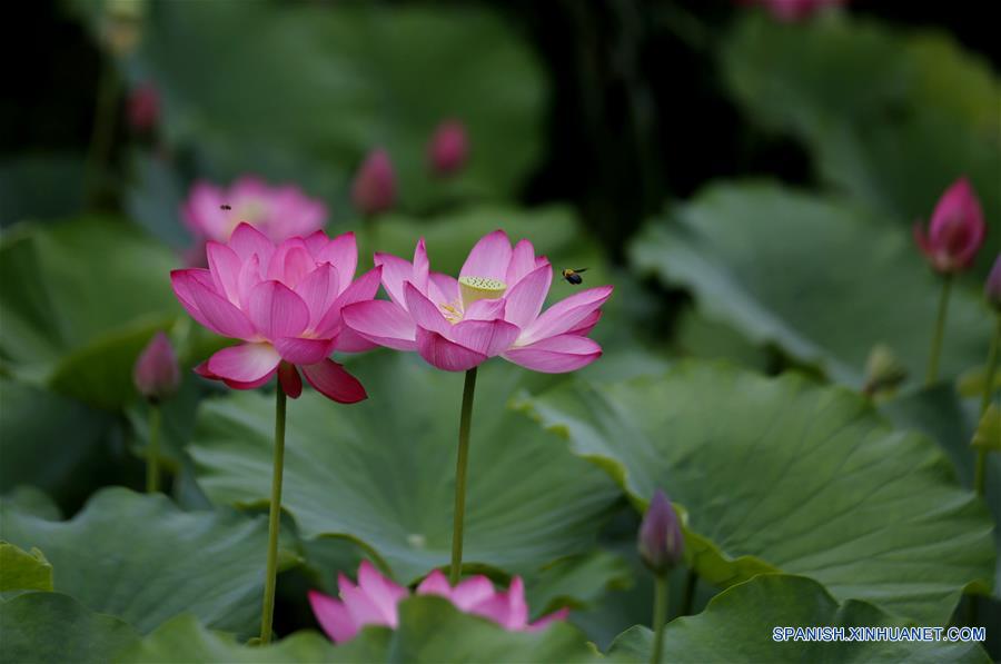 SHANDONG, julio 2, 2018 (Xinhua) -- Vista de flores de loto en el punto escénico de Hongshizhai, en el condado Yinan de Linyi, provincia de Shandong, en el este de China, el 2 de julio de 2018. (Xinhua/Wang Yanbing)