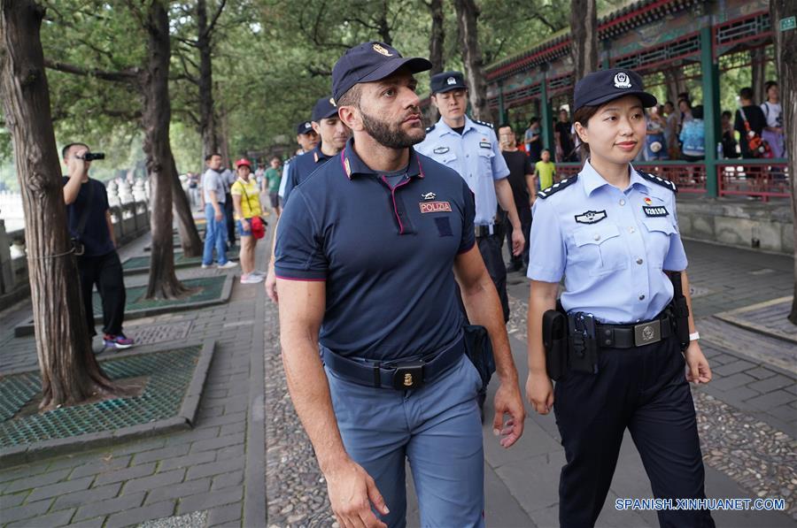 BEIJING, julio 23, 2018 (Xinhua) -- Oficiales de policía italianos y chinos patrullan en el Palacio de Verano en Beijing, capital de China, el 23 de julio de 2018. Ocho oficiales de policía italianos empezaron el 16 de julio a visitar sitios turísticos en cuatro ciudades chinas, con sus homólogos locales. El patrullaje conjunto, el segundo ejercicio en su tipo entre la policía china e italiana en China, durará dos semanas. Las cuatro ciudades son Beijing, Shanghai, Hangzhou y Xi'an. (Xinhua/Ju Huanzong)