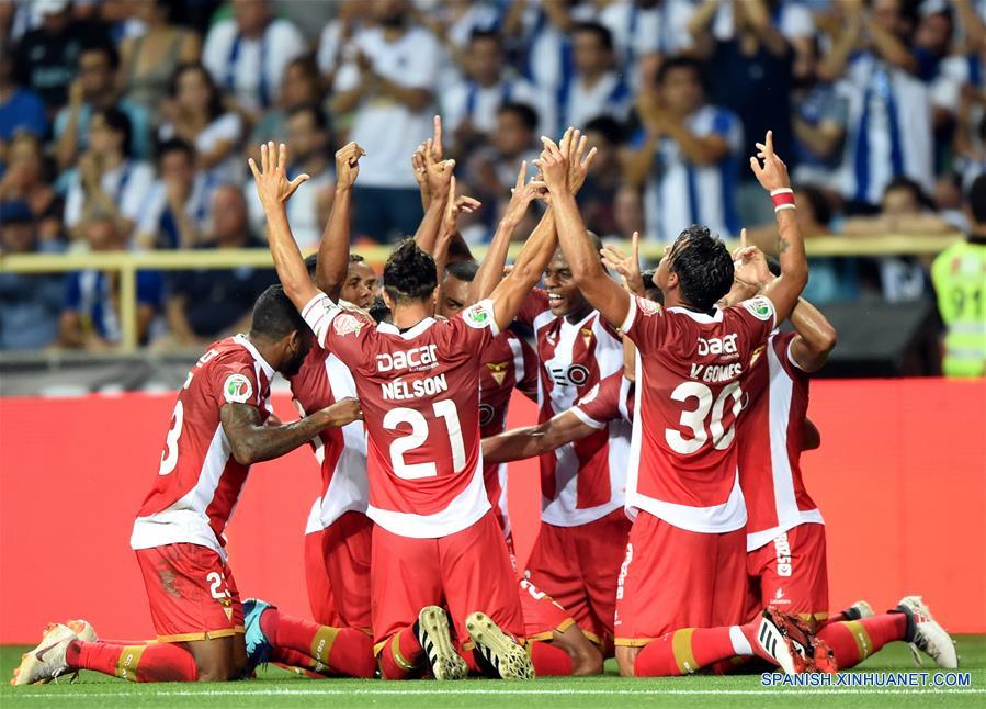 AVEIRO, agosto 4, 2018 (Xinhua) -- Jugadores de CD Aves festejan una anotación durante un partido correspondiente a la final de la Supercopa de Portugal 2018, ante FC Porto, celebrado en el Estadio Municipal de Aveiro, en Aveiro, Portugal, el 4 de agosto de 2018. (Xinhua/Zhang Liyun)