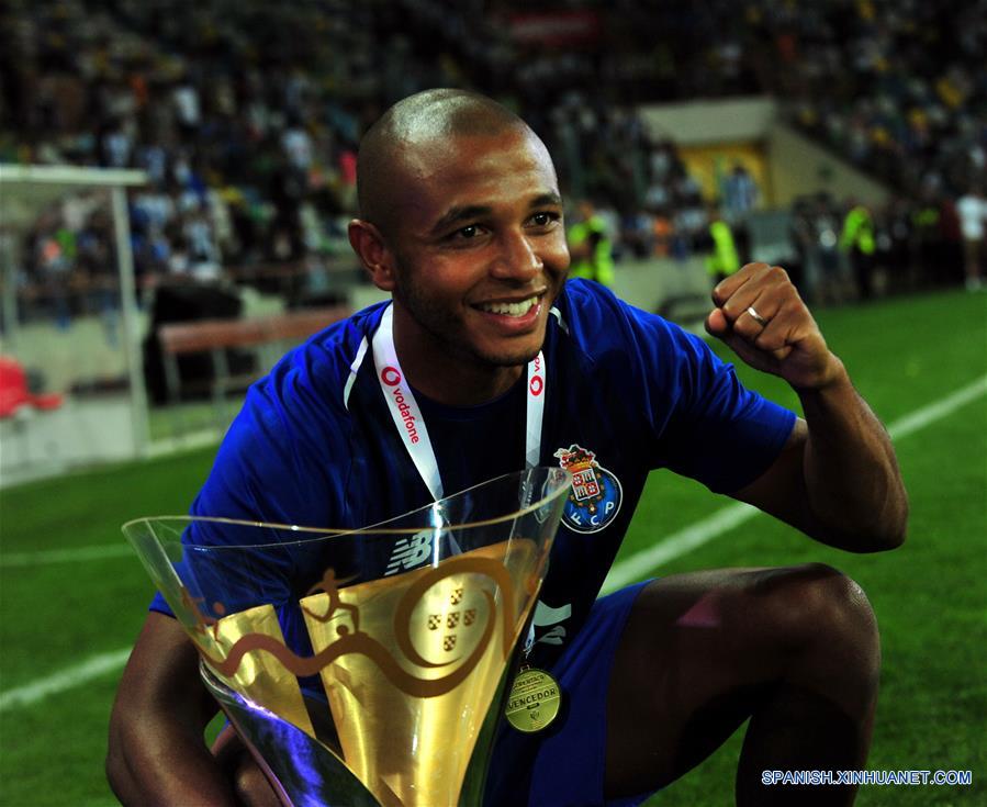 AVEIRO, agosto 4, 2018 (Xinhua) -- El jugador Yacine Brahimi, de FC Porto, sostiene el trofeo para festejar la victoria de su equipo al término de un partido correspondiente a la final de la Supercopa de Portugal 2018, ante CD Aves, celebrado en el Estadio Municipal de Aveiro, en Aveiro, Portugal, el 4 de agosto de 2018. (Xinhua/Zhang Liyun)