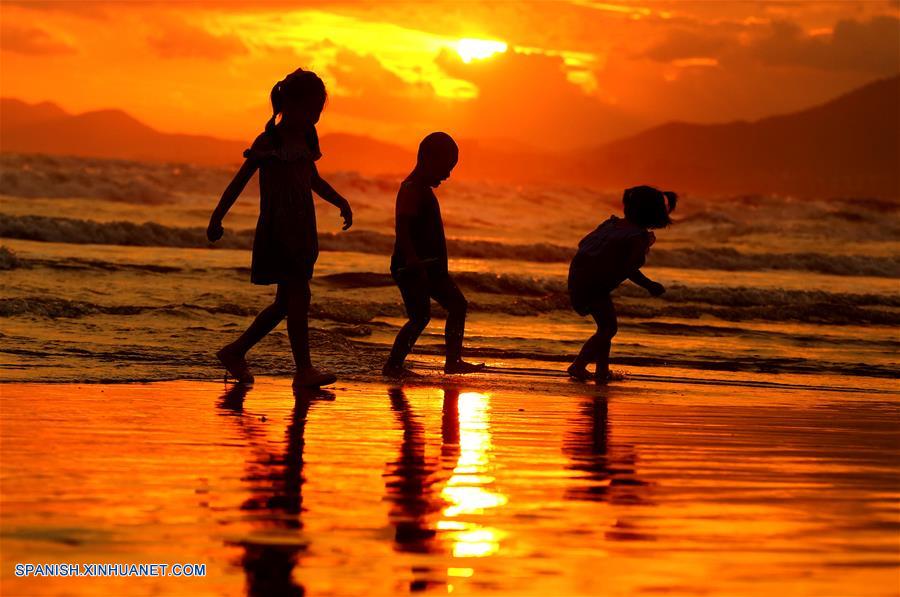 HAINAN, agosto 13, 2018 (Xinhua) -- Imagen del 12 de agosto de 2018 de personas jugando en la playa durante la puesta de sol en Sanya, provincia de Hainan, en el sur de China. (Xinhua/Chen Wenwu)