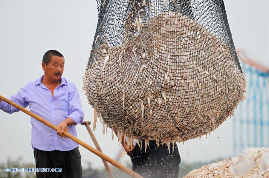ANHUI, agosto 13, 2018 (Xinhua) -- Imagen del 12 de agosto de 2018 de pescadores embarcando anchoas en el área Lago Hongze de la ciudad de Huai'an, provincia de Anhui, en el este de China. (Xinhua/Wang Kaicheng)