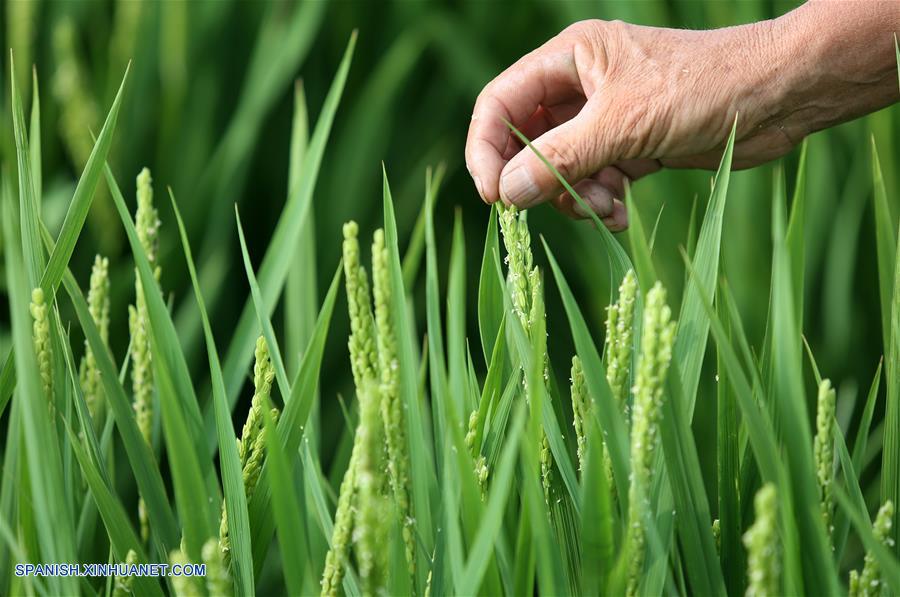 SHANDONG, agosto 20, 2018 (Xinhua) -- Un agricultor revisa el arroz en un campo, en el condado Tancheng de la ciudad de Linyi, provincia de Shandong, en el este de China, el 20 de agosto de 2018. Los agricultores se ocupan administrando sus campos para la cosecha de oto?o. (Xinhua/Zhang Chunlei)