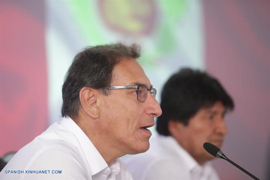 COBIJA, septiembre 3, 2018 (Xinhua) -- El presidente de Perú, Martín Vizcarra (frente), pronuncia un discurso previo a la instalación del IV Gabinete Binacional, en la ciudad de Cobija, Bolivia, el 3 de septiembre de 2018. Los gobiernos de Bolivia y Perú instalaron el lunes el IV Gabinete Binacional en la ciudad boliviana de Cobija (norte), presidido por sus presidentes Evo Morales y Martín Vizcarra, respectivamente, para revisar avances de la agenda bilateral y perfilar acciones prioritarias. (Xinhua/ANDINA/Prensa Presidencia)