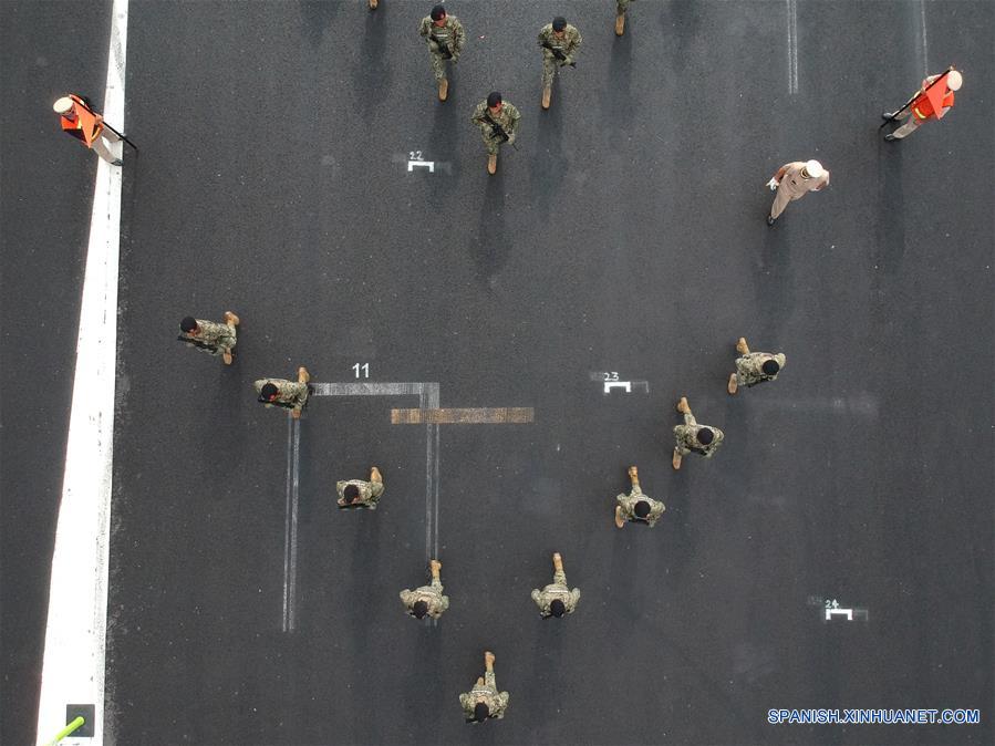 Imagen tomada con un dron de integrantes de la Marina-Armada de México participando durante el pase de revista del Contingente Naval que participará en el Desfile Cívico Militar por el 208 Aniversario del Inicio de la Guerra de Independencia de México, en la Ciudad de México, capital de México, el 12 de septiembre de 2018. (Xinhua/Francisco Ca?edo)