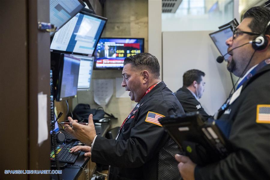 NUEVA YORK, octubre 10, 2018 (Xinhua) -- Trabajadores laboran en la Bolsa de Valores de Nueva York, en Nueva York, Estados Unidos, el 10 de octubre de 2018. Wall Street registró el miércoles una aguda caída debido a que el temor por el alza de las tasas y las liquidaciones de acciones tecnológicas sacudieron al mercado. (Xinhua/Wang Ying)