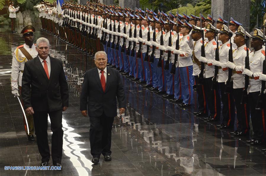 LA HABANA, octubre 25, 2018 (Xinhua) -- El presidente de Cuba, Miguel Díaz-Canel (i), sostiene una ceremonia de bienvenida oficial para el presidente de El Salvador, Salvador Sánchez Cerén (d), en el Palacio de la Revolución en La Habana, Cuba, el 25 de octubre de 2018. El presidente de El Salvador, Salvador Sánchez Cerén, colocó una ofrenda floral al Héroe Nacional de Cuba, José Martí, en el memorial que lleva su nombre en La Habana, capital de Cuba, y posteriormente se reunió con su homólogo cubano, Miguel Díaz-Canel, como parte del programa que el presidente centroamericano lleva a cabo durante su visita a Cuba, y que culminará el próximo sábado, de acuerdo con información de la prensa local. (Xinhua/Joaquín Hernández)