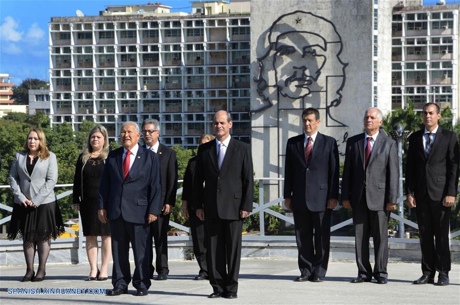LA HABANA, octubre 25, 2018 (Xinhua) -- El presidente de El Salvador, Salvador Sánchez Cerén (3-i), acompa?ado por el viceministro de Relaciones Exteriores de Cuba, Rogelio Sierra Díaz (4-d), acude a la ceremonia de colocación de ofrenda floral en el monumento al Héroe Nacional de Cuba, José Martí, en la Plaza de la Revolución en La Habana, Cuba, el 25 de octubre de 2018. El presidente de El Salvador, Salvador Sánchez Cerén, colocó una ofrenda floral al Héroe Nacional de Cuba, José Martí, en el memorial que lleva su nombre en La Habana, capital de Cuba, y posteriormente se reunió con su homólogo cubano, Miguel Díaz-Canel, como parte del programa que el presidente centroamericano lleva a cabo durante su visita a Cuba, y que culminará el próximo sábado, de acuerdo con información de la prensa local. (Xinhua/Joaquín Hernández)