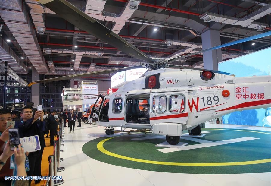 SHANGHAI, noviembre 6, 2018 (Xinhua) -- Visitantes observan el helicóptero AW189, de la compa?ía de alta tecnología italiana Leonardo Helicopter, durante la primera Exposición Internacional de Importaciones de China (CIIE), en Shanghai, en el este China, el 6 de noviembre de 2018. El área de exhibición de Equipamiento Inteligente de Alta Gama en la CIIE cubre inteligencia artificial, automatización y robotización industrial, fábricas digitales, energía nueva, equipamiento eléctrico y energético, tecnologías y equipamiento aeroespacial y de aviación, atrayendo a muchos visitantes. (Xinhua/Ding Ting)