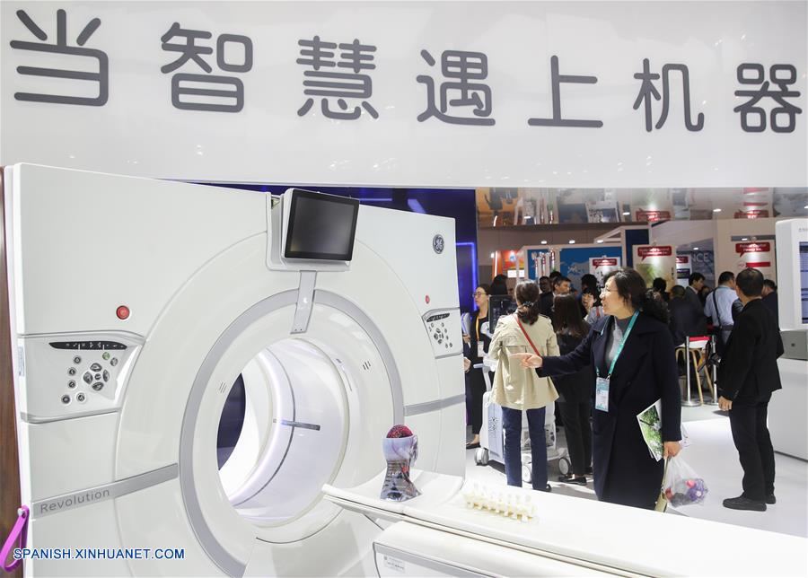 SHANGHAI, noviembre 6, 2018 (Xinhua) -- Visitantes observan un escáner CT de General Electric (GE), durante la primera Exposición Internacional de Importaciones de China (CIIE), en Shanghai, en el este China, el 6 de noviembre de 2018. El área de exhibición de Equipamiento Inteligente de Alta Gama en la CIIE cubre inteligencia artificial, automatización y robotización industrial, fábricas digitales, energía nueva, equipamiento eléctrico y energético, tecnologías y equipamiento aeroespacial y de aviación, atrayendo a muchos visitantes. (Xinhua/Ding Ting)