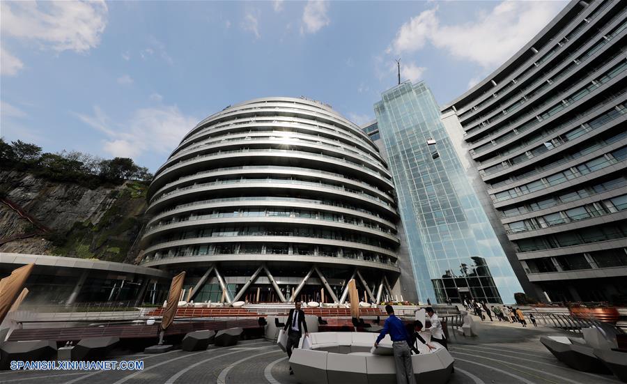 SHANGHAI, noviembre 15, 2018 (Xinhua) -- Imagen del 13 de noviembre de 2018, de trabajadores acomodando sillas en el Intercontinental Shanghai Wonderland, también conocido como el Hotel Cantera Shimao, en el distrito de Songjiang de Shanghai, en el este de China. El hotel de 88 metros de profundidad, construido verticalmente a lo largo de un precipicio de una cantera subterránea llena de agua, hizo su debut público en Shanghai el jueves. El hotel de 336 cuartos tiene 18 pisos, con dos bajo el agua y dos sobre el suelo, además de un restaurante e instalaciones deportivas y de recreación, que incluyen escalada de roca y salto de bungee, según el desarrollador Shimao Group. (Xinhua/Fang Zhe)
