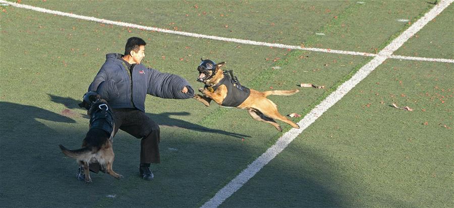 Perros policía atacan a un enemigo imaginario durante un concurso de habilidades de perros de la Policía Nacional, en Beijing, capital de China. El concurso fue clausurado el viernes. (Xinhua/Cai Yang)