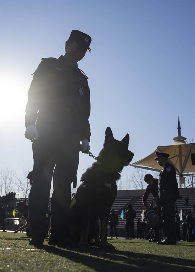 Un entrenador conduce a un perro policía para participar en un concurso de habilidades de perros de la Policía Nacional, en Beijing, capital de China. El concurso fue clausurado el viernes. (Xinhua/Cai Yang)