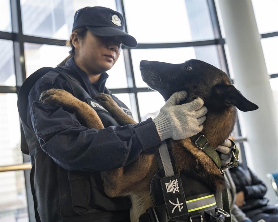 La entrenadora Niu Zhimin calma al perro policía "Ouyang" durante un concurso de habilidades de perros de la Policía Nacional, en Beijing, capital de China. El concurso fue clausurado el viernes. (Xinhua/Cai Yang)