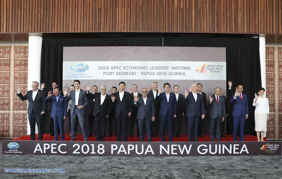 PORT MORESBY, noviembre 18, 2018 (Xinhua) -- El presidente chino, Xi Jinping (5-i-frente), y otros líderes y representantes de economías miembros del Foro de Cooperación Económica Asia-Pacífico (APEC) posan para una fotografía grupal previo a la 26 Reunión de Líderes Económicos del APEC en Port Moresby, Papúa Nueva Guinea, el 18 de noviembre de 2018. Xi pronunció un discurso titulado "Aprovechar las oportunidades de nuestros tiempos para perseguir conjuntamente la prosperidad de Asia-Pacífico" en la 26 Reunión de Líderes Económicos del APEC en Port Moresby el domingo. (Xinhua/Ding Lin)