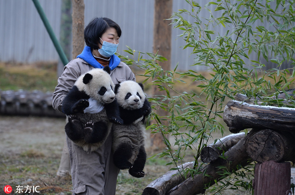 Los cachorros de panda gemelos durante la ceremonia de nombramiento en la base de reproducción Shenshuping de la Reserva Natural Nacional Wolong, en las prefecturas autónomas tibetana y qiang de Ngawa, provincia de Sichuan, suroeste de China, el 26 de diciembre de 2018. [Foto / IC]