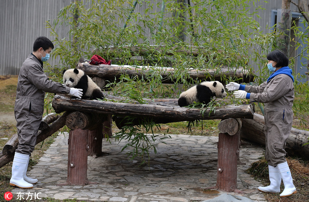 Los cachorros de panda gemelos durante la ceremonia de nombramiento en la base de reproducción Shenshuping de la Reserva Natural Nacional Wolong, en las prefecturas autónomas tibetana y qiang de Ngawa, provincia de Sichuan, suroeste de China, el 26 de diciembre de 2018. [Foto / IC]