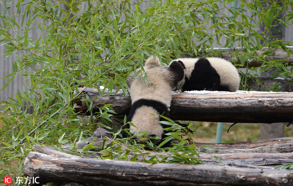 Los cachorros de panda gemelos durante la ceremonia de nombramiento en la base de reproducción Shenshuping de la Reserva Natural Nacional Wolong, en las prefecturas autónomas tibetana y qiang de Ngawa, provincia de Sichuan, suroeste de China, el 26 de diciembre de 2018. [Foto / IC]