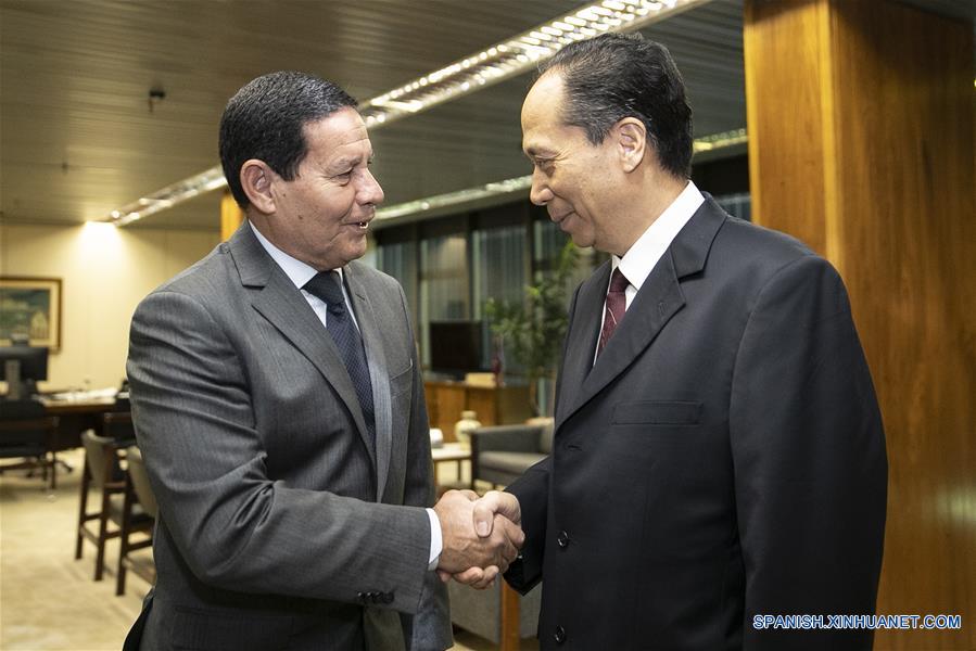 El enviado especial del presidente chino Xi Jinping, Ji Bingxuan (d), también vicepresidente del Comité Permanente de la Asamblea Popular Nacional, se reúne con el nuevo vicepresidente de Brasil, Hamilton Mourao, en Brasilia, Brasil, el 2 de enero de 2019. (Xinhua/Li Ming)
