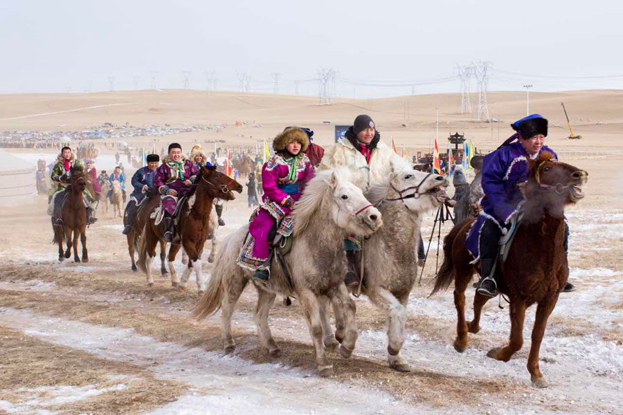 Pastores vestidos con ropa tradicional de Mongolia montan a camello para participar en el Nadam tradicional de invierno celebrado en Xiliinhot, región autónoma de Mongolia Interior, el 6 de enero de 2019. [Foto por Cui Weiguang / chinadaily.com.cn]