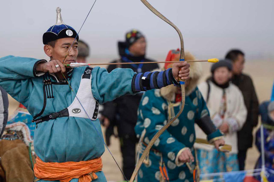 Pastores vestidos con ropa tradicional de Mongolia participan en el Nadam tradicional de invierno celebrado en Xiliinhot, región autónoma de Mongolia Interior, el 6 de enero de 2019. [Foto por Cui Weiguang / chinadaily.com.cn]