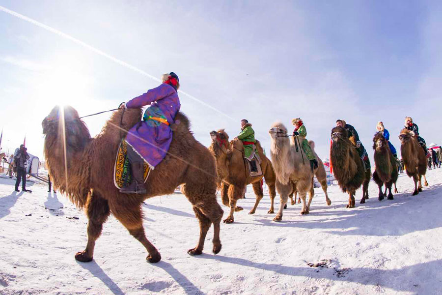 Pastores vestidos con ropa tradicional de Mongolia montan a camello para participar en el Nadam tradicional de invierno celebrado en Xiliinhot, región autónoma de Mongolia Interior, el 6 de enero de 2019. [Foto por Cui Weiguang / chinadaily.com.cn]
