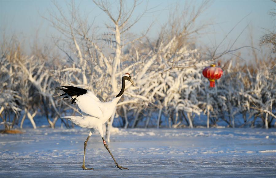 HEILONGJIANG, enero 11, 2019 (Xinhua) -- Imagen del 10 de enero de 2019 de una grulla de coronilla roja criada artificialmente caminando en la Reserva Nacional Natural de Zhalong en Qiqihar, provincia de Heilongjiang, en el noreste de China. La Reserva Nacional Natural de Zhalong sirve como hábitat para más de 190 especies de aves raras como las grullas de coronilla roja. (Xinhua/Wang Jianwei)
