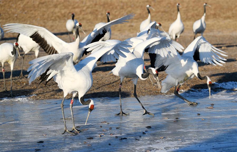 HEILONGJIANG, enero 11, 2019 (Xinhua) -- Imagen del 10 de enero de 2019 de grullas de coronilla roja criadas artificialmente descansando en la Reserva Nacional Natural de Zhalong en Qiqihar, provincia de Heilongjiang, en el noreste de China. La Reserva Nacional Natural de Zhalong sirve como hábitat para más de 190 especies de aves raras como las grullas de coronilla roja. (Xinhua/Wang Jianwei)