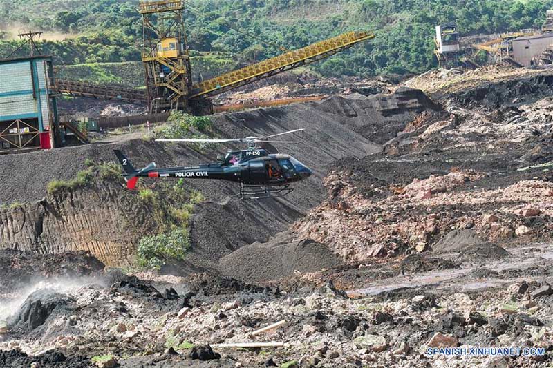 Imagen proveída por AGENCIA ESTADO de un helicóptero sobrevolando el lugar destruido tras la ruptura de una represa de residuos de la minera brasile?a Vale, en Brumadinho, ciudad en la región metropolitana de Belo Horizonte, capital regional de Minas Gerais, Brasil, el 25 de enero de 2019. Al menos 200 desaparecidos y cuatro heridos es el saldo preliminar de la ruptura de una represa de residuos de la minera brasile?a Vale, la mayor exportadora de hierro del mundo, en la región metropolitana de Belo Horizonte, informó el viernes el cuartel general de Bomberos de la ciudad. (Xinhua/Uarlen Valerio/O TEMPO/AGENCIA ESTADO)