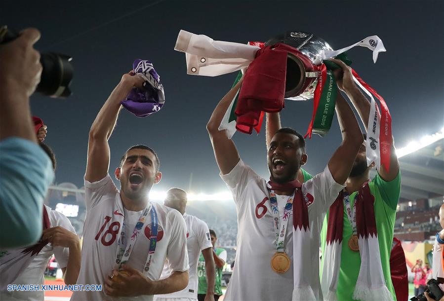 ABU DHABI, febrero 1, 2019 (Xinhua) -- El jugador Abdelaziz Hatim (2-d), de Qatar, festeja con sus compa?eros al término del partido de la final de la Copa Asiática 2019 de la Confederación Asiática de Fútbol (AFC, por sus siglas en inglés), ante Japón, en Abu Dhabi, Emiratos Arabes Unidos (EAU), el 1 de febrero de 2019. (Xinhua/Cao Can)