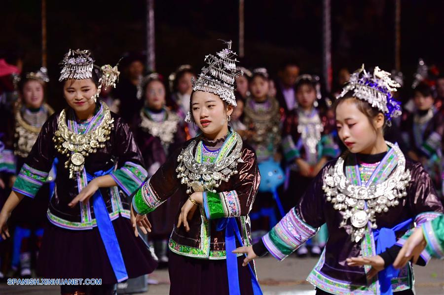 GUANGXI, febrero 7, 2019 (Xinhua) -- Imagen del 6 de febrero de 2019 de personas del grupo étnico Miao realizando una actuación durante una reunión del Festival de Primavera llevada a cabo en el segundo día del A?o Nuevo Lunar chino, en la villa de Yaogao del municipio de Gandong en el Condado Autónomo Miao de Rongshui, en la Región Autónoma Zhuang de Guangxi, en el sur de China. (Xinhua/Huang Xiaobang)