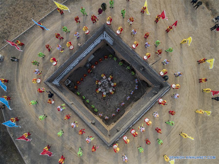 GANSU, febrero 18, 2019 (Xinhua) -- Imagen del 16 de febrero de 2019 de una vista aérea de una presentación de la Opera Gaoshan, en la villa Liujiawan, en el municipio Yulong del distrito Wudu, en Longnan, en la provincia de Gansu, en el noroeste de China. La Opera Gaoshan de Longnan se originó en el actual distrito de Wudu hace más de 700 a?os y ha sido enlistada como uno de los patrimonios culturales inmateriales de China. Presentando una coreografía única que recrea escenas de la vida cotidiana, esta ópera folclórica es interpretada típicamente para conmemorar el Festival de la Linterna, el último día de las celebraciones por el A?o Nuevo Lunar chino. (Xinhua/Cai Yang)