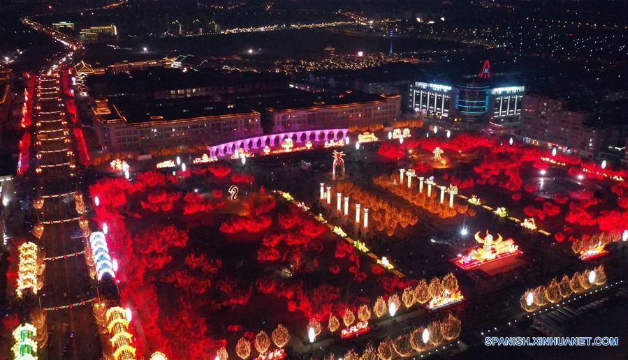 TIANJIN, febrero 18, 2019 (Xinhua) -- Vista aérea de un espectáculo de linternas en el poblado de Yangliuqing del distrito de Xiqing, en Tianjin, en el norte de China, el 18 de febrero de 2019. Muchos lugares en el país han sido decorados con linternas para celebrar el próximo Festival de la Linterna, que se conmemora el 19 de febrero de este a?o. (Xinhua/Li Ran)