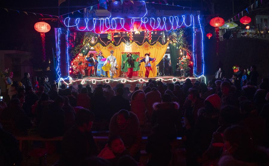 GANSU, febrero 18, 2019 (Xinhua) -- Imagen del 16 de febrero de 2019 de residentes observando una presentación de la Opera Gaoshan, en la villa Liujiawan, en el municipio Yulong del distrito Wudu, en Longnan, en la provincia de Gansu, en el noroeste de China. La Opera Gaoshan de Longnan se originó en el actual distrito de Wudu hace más de 700 a?os y ha sido enlistada como uno de los patrimonios culturales inmateriales de China. Presentando una coreografía única que recrea escenas de la vida cotidiana, esta ópera folclórica es interpretada típicamente para conmemorar el Festival de la Linterna, el último día de las celebraciones por el A?o Nuevo Lunar chino. (Xinhua/Cai Yang)