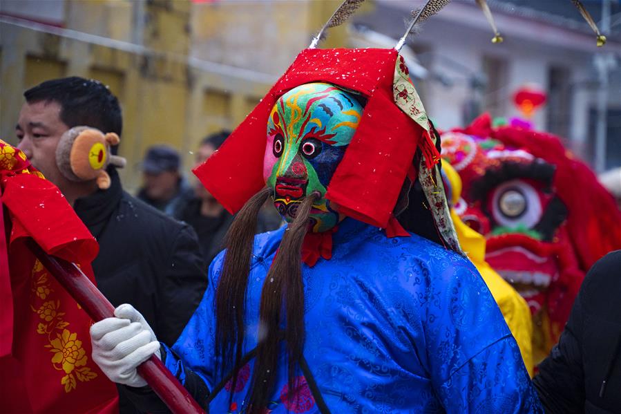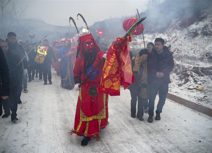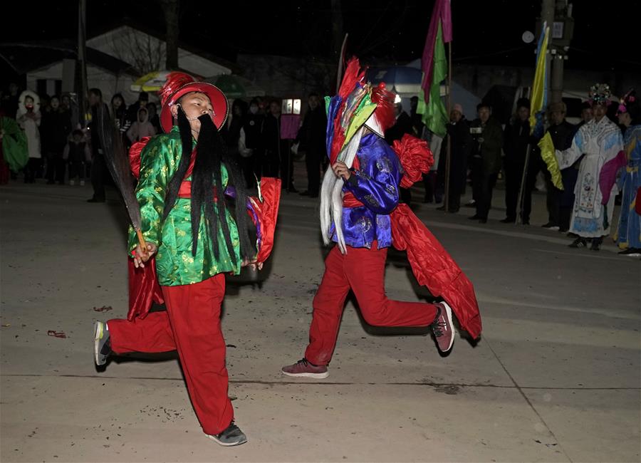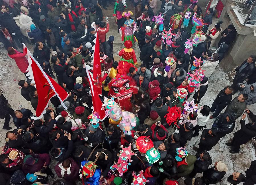 SHANXI, febrero 18, 2019 (Xinhua) -- Artistas folclóricos realizan una presentación durante un espectáculo shehuo, en el condado de Guangling, en la provincia de Shanxi, en el norte de China, el 18 de febrero de 2019. Muchos lugares en el país han sido decorados con linternas para celebrar el próximo Festival de los Faroles, que se conmemora el 19 de febrero de este a?o. (Xinhua/Huo Feifei)