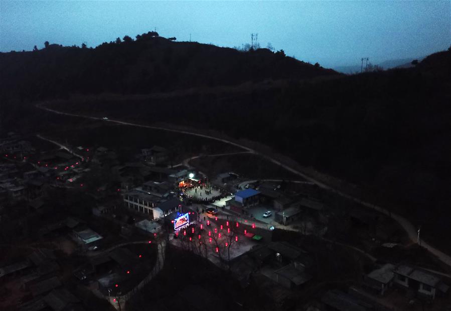 GANSU, febrero 18, 2019 (Xinhua) -- Imagen del 17 de febrero de 2019 de una vista aérea de residentes observando un desfile de la Opera Gaoshan, en la villa Maojiazhuang, en el municipio Yulong del distrito Wudu, en Longnan, en la provincia de Gansu, en el noroeste de China. La Opera Gaoshan de Longnan se originó en el actual distrito de Wudu hace más de 700 a?os y ha sido enlistada como uno de los patrimonios culturales inmateriales de China. Presentando una coreografía única que recrea escenas de la vida cotidiana, esta ópera folclórica es interpretada típicamente para conmemorar el Festival de la Linterna, el último día de las celebraciones por el A?o Nuevo Lunar chino. (Xinhua/Cai Yang)