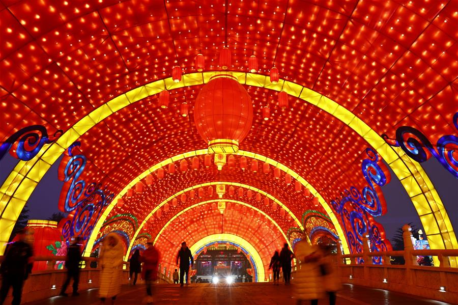 GANSU, febrero 18, 2019 (Xinhua) -- Imagen del 17 de febrero de 2019 de visitantes observando faroles en el condado Minqin de Wuwei, en la provincia Gansu, en el noroeste de China. Muchos lugares por todo el país han decorado con faroles para celebrar el próximo Festival de los Faroles, el cual se celebrará el 19 de febrero de este a?o. (Xinhua/Jiang Aiping)