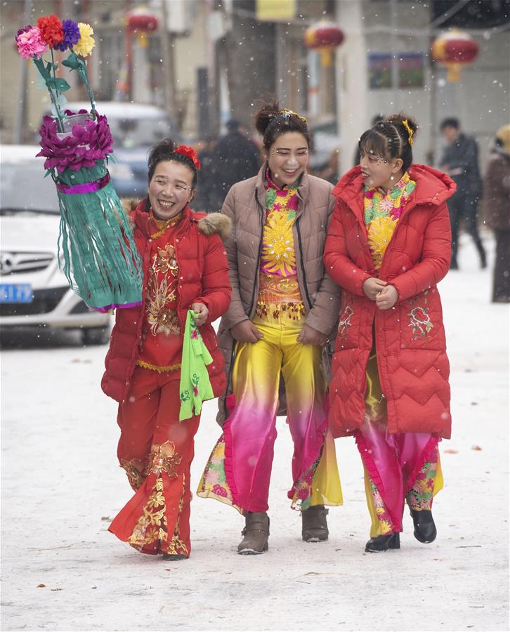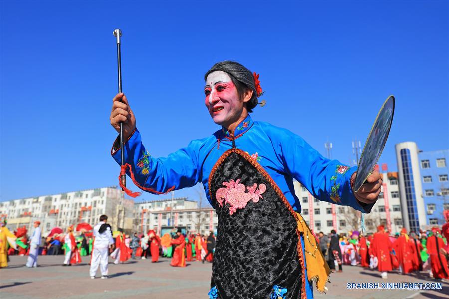 GANSU, febrero 18, 2019 (Xinhua) -- Imagen del 17 de febrero de 2019 de intérpretes de la Opera Gaoshan, uniéndose a un desfile en la villa Maojiazhuang, en el municipio Yulong del distrito Wudu, en Longnan, en la provincia de Gansu, en el noroeste de China. La Opera Gaoshan de Longnan se originó en el actual distrito de Wudu hace más de 700 a?os y ha sido enlistada como uno de los patrimonios culturales inmateriales de China. Presentando una coreografía única que recrea escenas de la vida cotidiana, esta ópera folclórica es interpretada típicamente para conmemorar el Festival de la Linterna, el último día de las celebraciones por el A?o Nuevo Lunar chino. (Xinhua/Cai Yang)