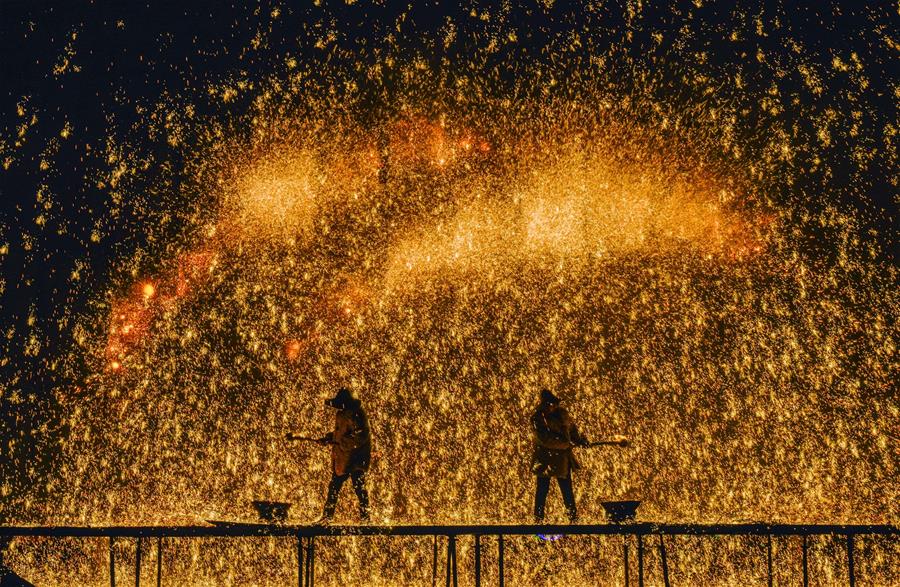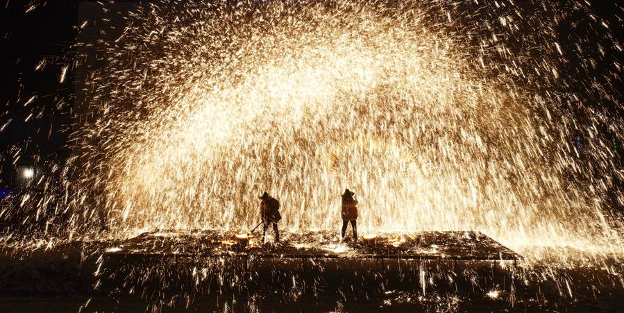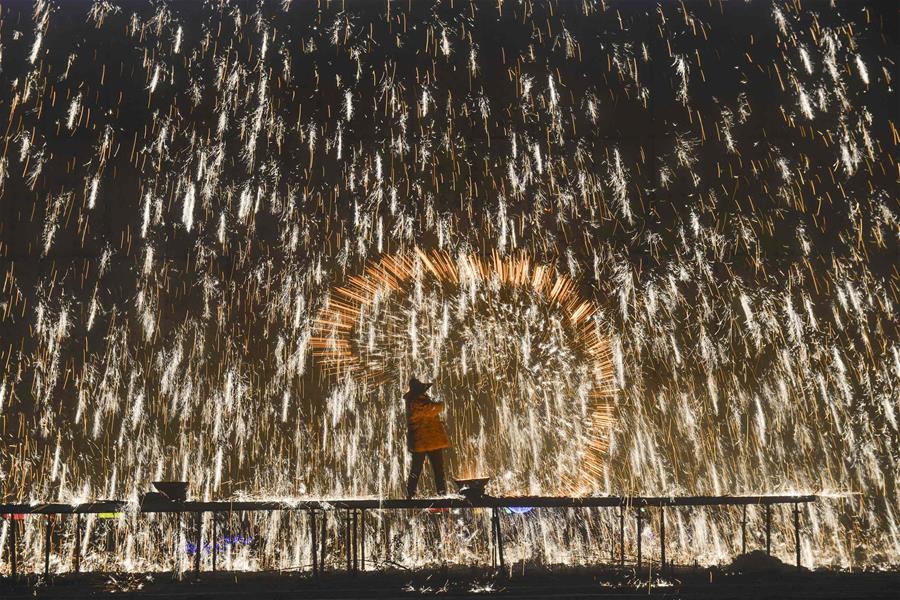 HEBEI, febrero 18, 2019 (Xinhua) -- Imagen del 17 de febrero de 2019 de artistas rociando hierro fundido, para crear fuegos artificiales durante el evento folclórico "Dashuhua" previo al Festival de la Linterna en la villa Shanligezhuang, en el municipio Tuanpiaozhuang de Zunhua, en la provincia de Hebei, en el norte de China. (Xinhua/Liu Mancang)