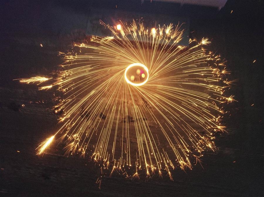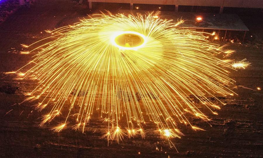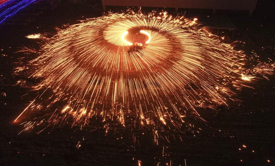 HEBEI, febrero 18, 2019 (Xinhua) -- Imagen del 17 de febrero de 2019 de una vista aérea rociando hierro fundido, para crear fuegos artificiales durante el evento folclórico "Dashuhua" previo al Festival de la Linterna en la villa Shanligezhuang, en el municipio Tuanpiaozhuang de Zunhua, en la provincia de Hebei, en el norte de China. (Xinhua/Liu Mancang)